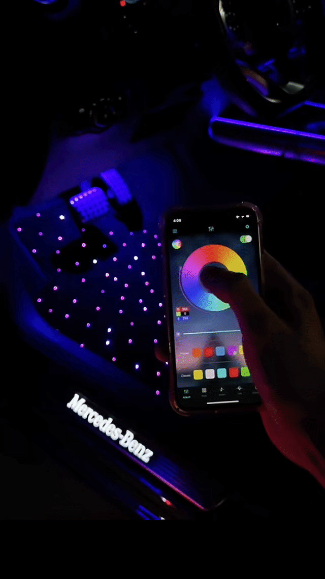 Dank Bluetooth-Steuerungkannst du die Beleuchtung deiner Glasfaser-Fußmatten ganz bequem per Smartphone anpassen. Über die App lassen sich Farben und Effekte individuell einstellen – so kreierst du mit nur wenigen Fingertipps genau die Stimmung, die zu dir und deinem Auto passt.
